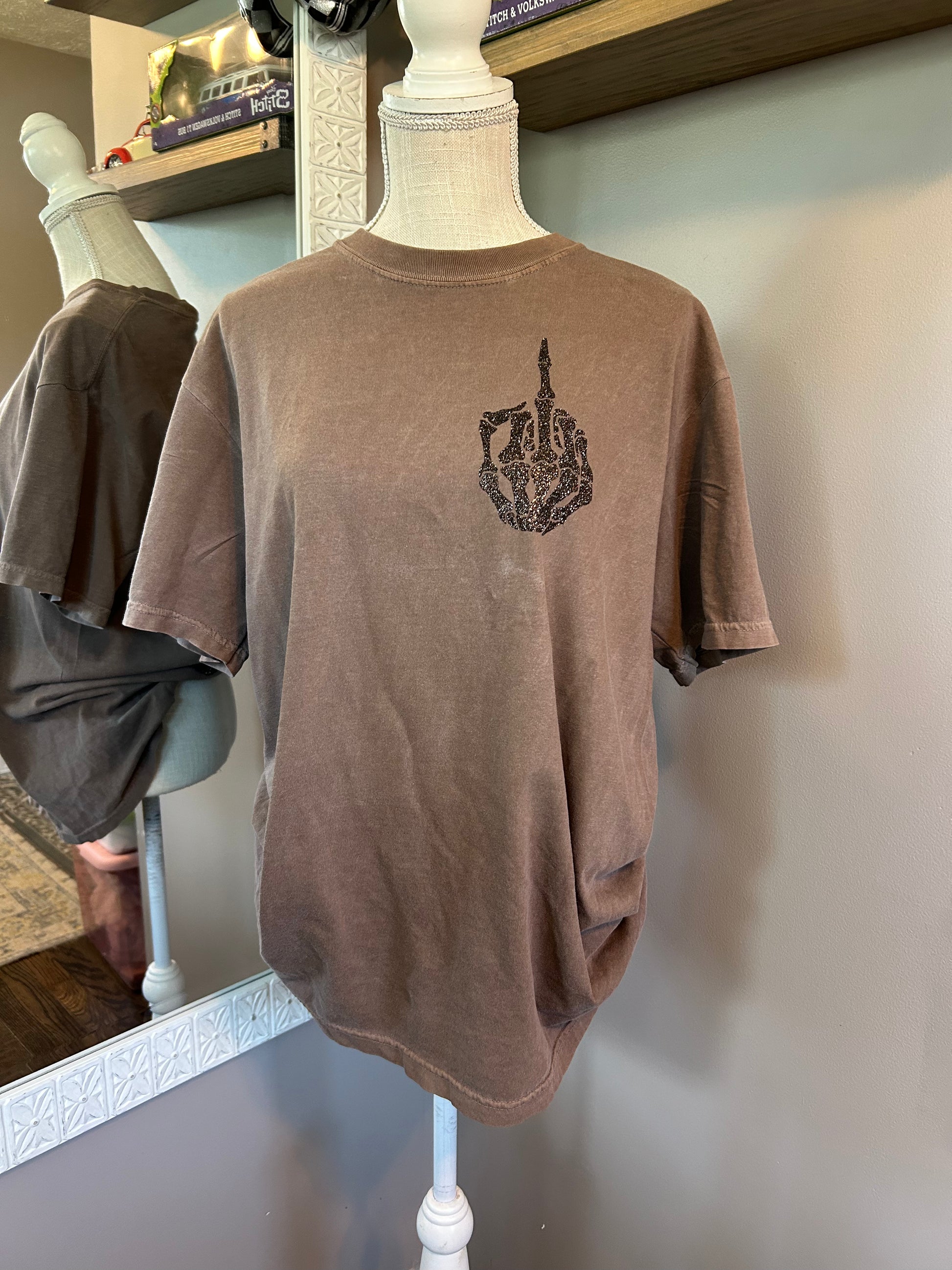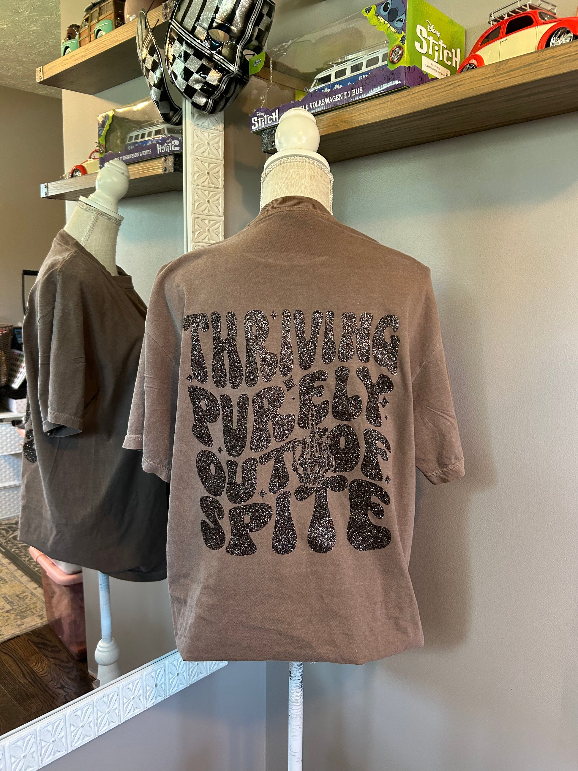 This brown T-shirt features the phrase "thriving purely out of spite" on the back in brown glitter vinyl, along with a middle finger design in glitter vinyl on the front.